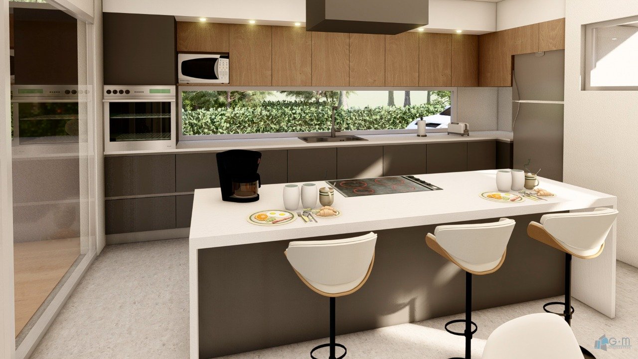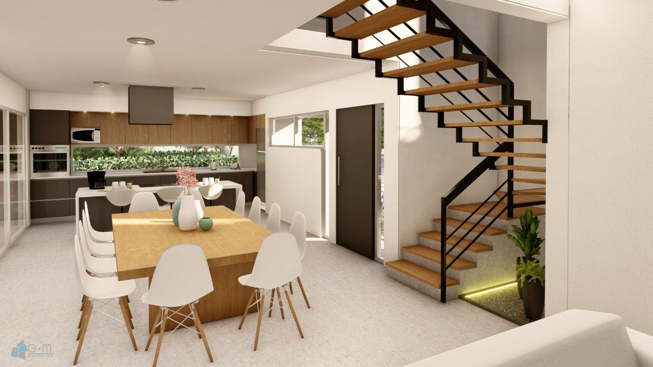 En planta baja se ubicaron las áreas sociales: living-comedor, cocina, habitación de húespedes, baño, lavadero y galería. Se diseñaron espacios amplios, integrados, priorizando la buena vinculación con los espacios exteriores.