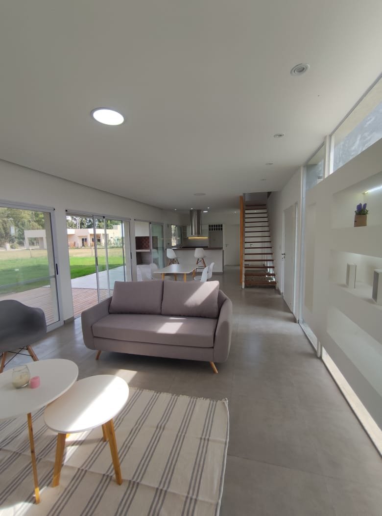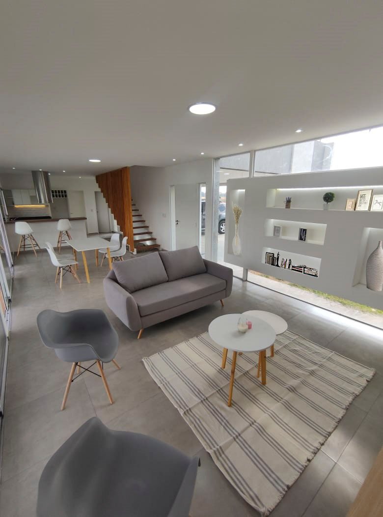 En planta baja se ubican: living-comedor, cocina, toilette, lavadero y galería exterior. La idea fue lograr una planta libre, integrada, que permita aprovechar al máximo el espacio y la vinculación visual con el exterior. Se utilizaron grandes ventanales, colores claros y madera para generar calidez y armonía.