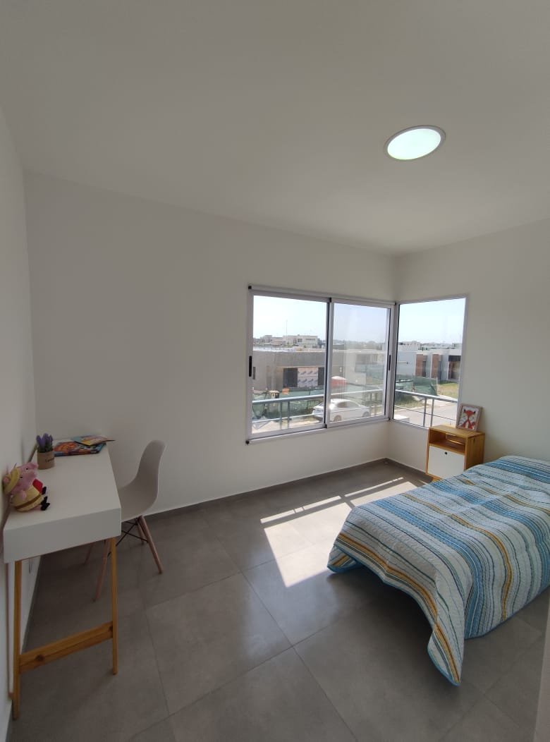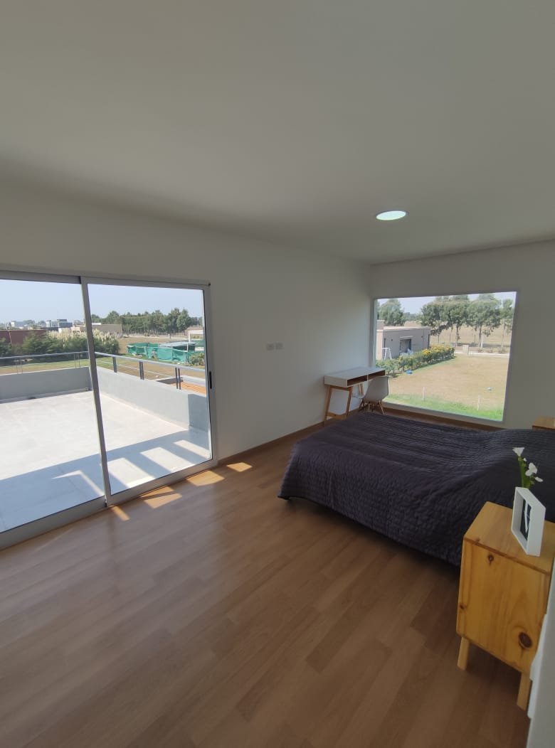 En planta alta se ubica el área privada, que a su vez se divide en dos sectores. Por un lado, se encuentran dos habitaciones para los hijos hacia el frente, con su baño privado y por otro la matrimonial con su baño en suite y vestidor. Esta última posee una gran terraza para poder disfrutar del espacio exterior y las visuales.