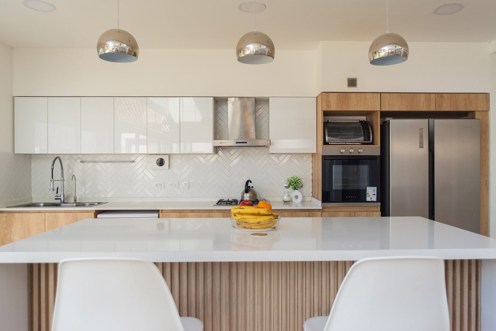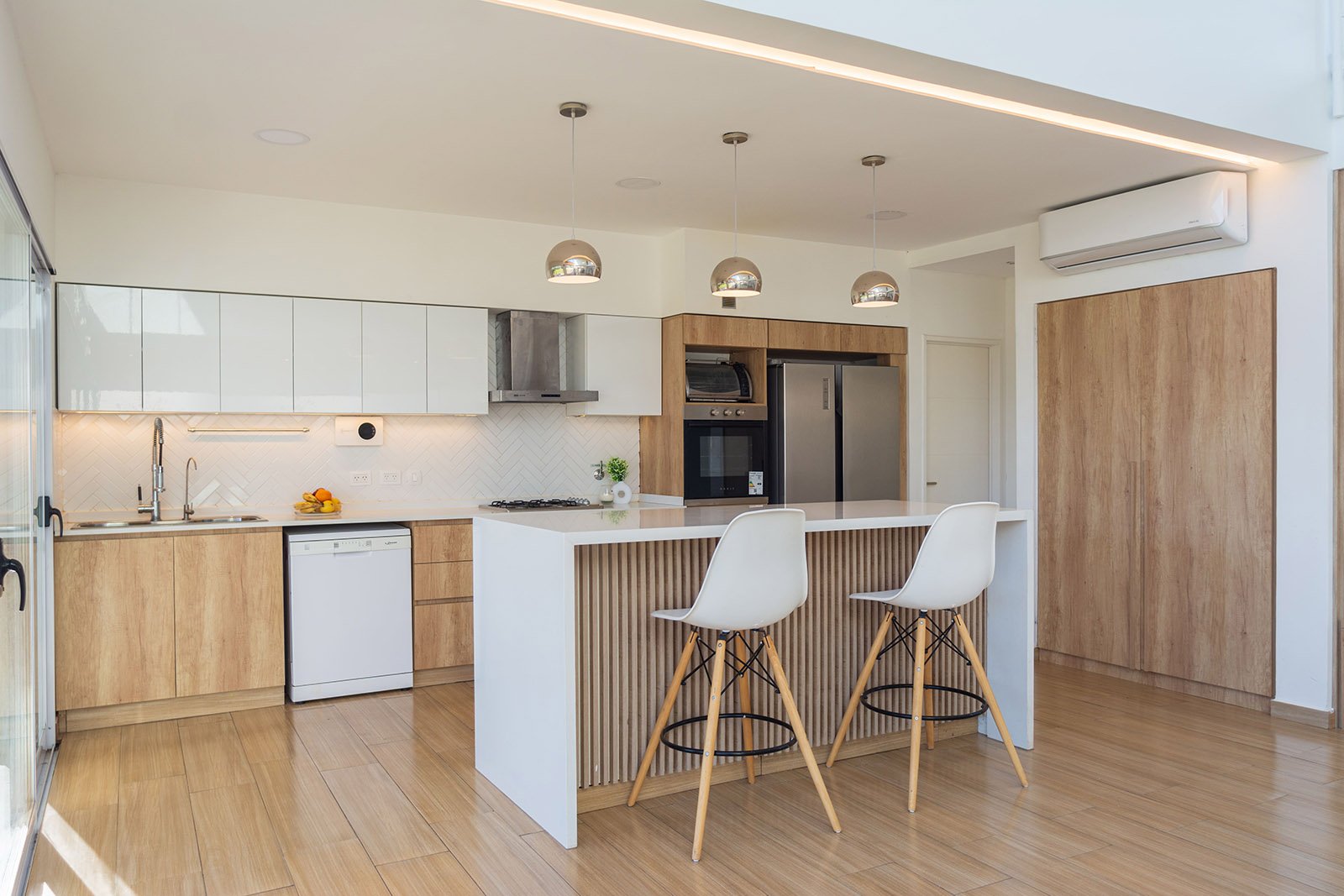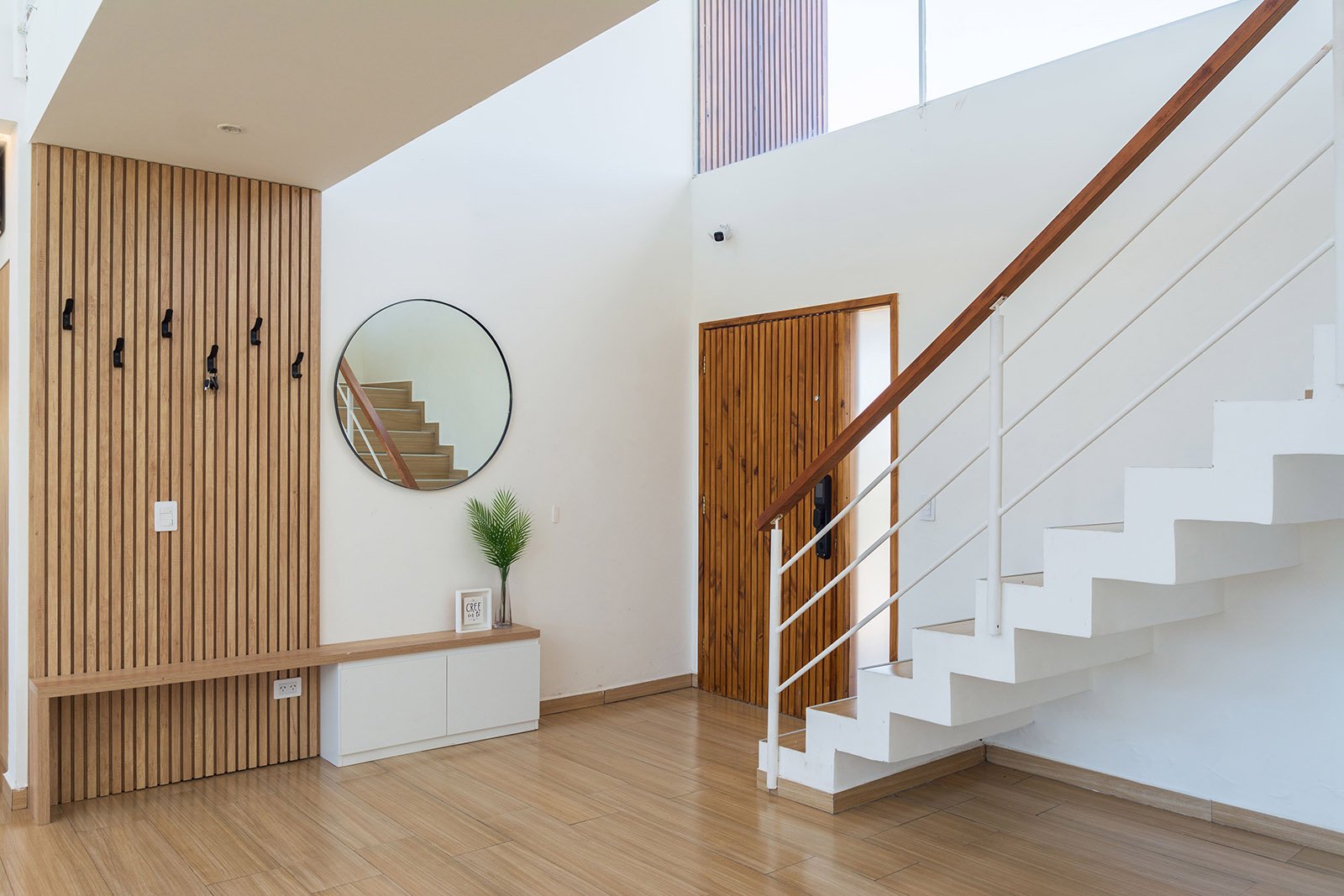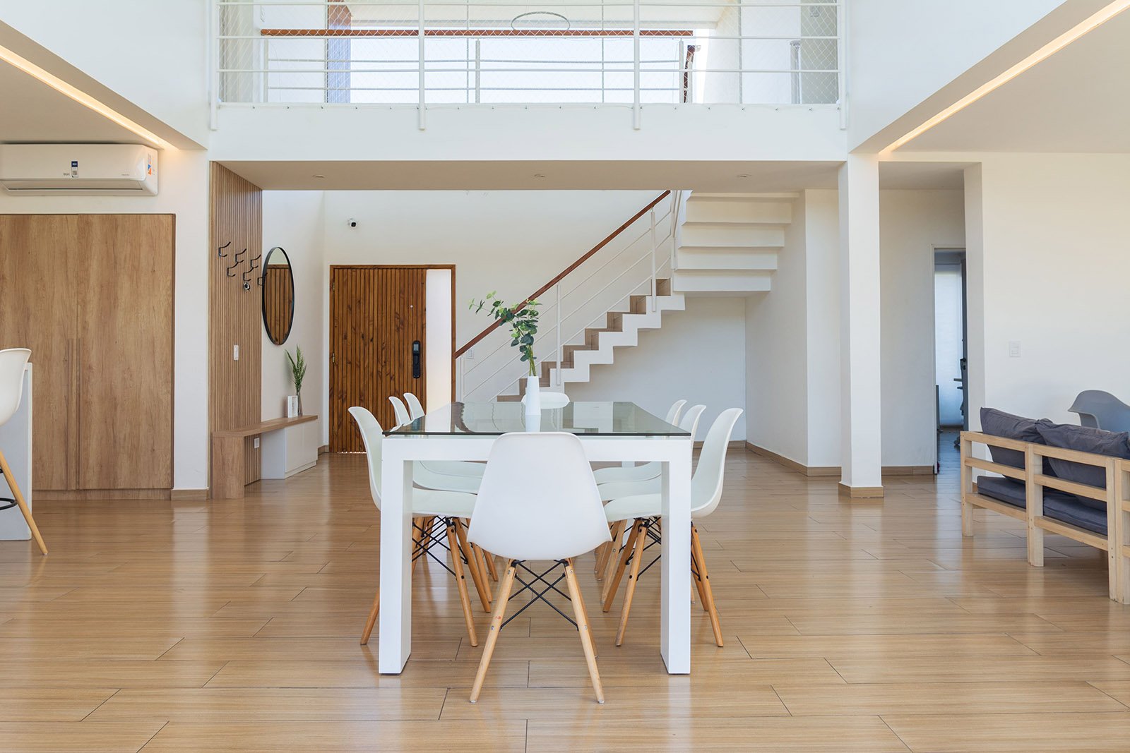 El diseño de la casa es moderno y minimalista. Se optó por utilizar colores claros, grandes ventanales y detalles en madera para generar calidez.