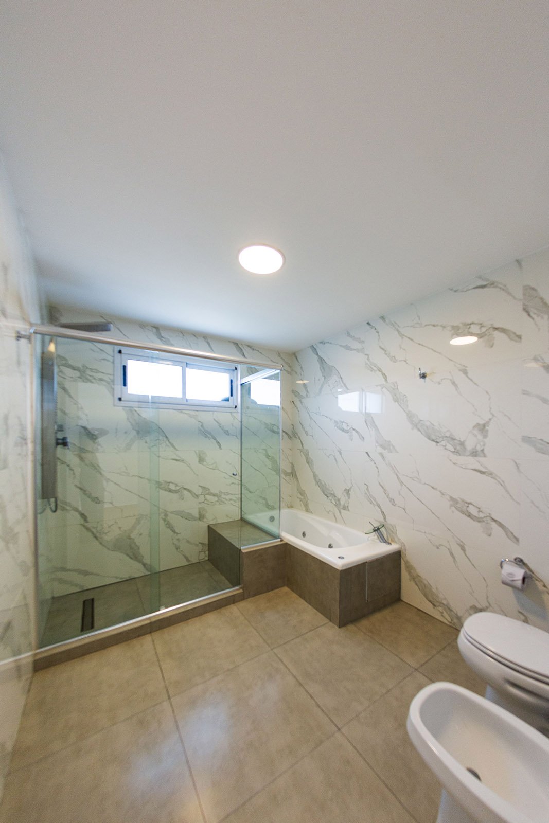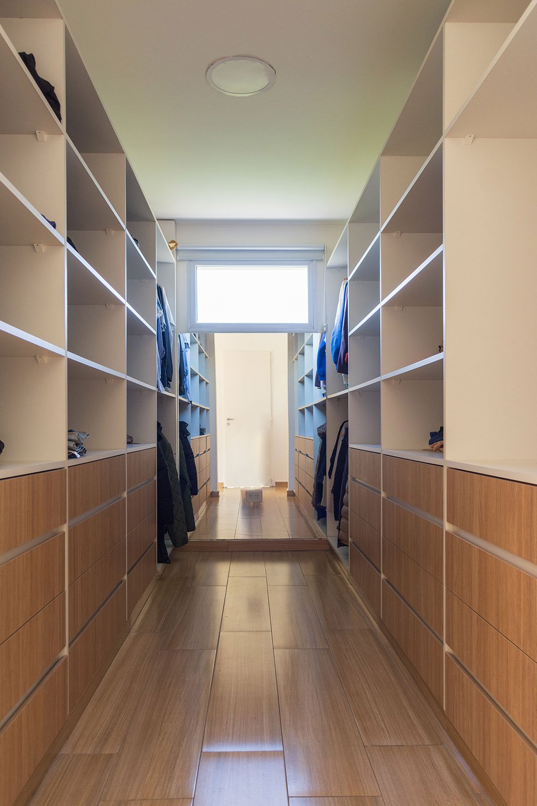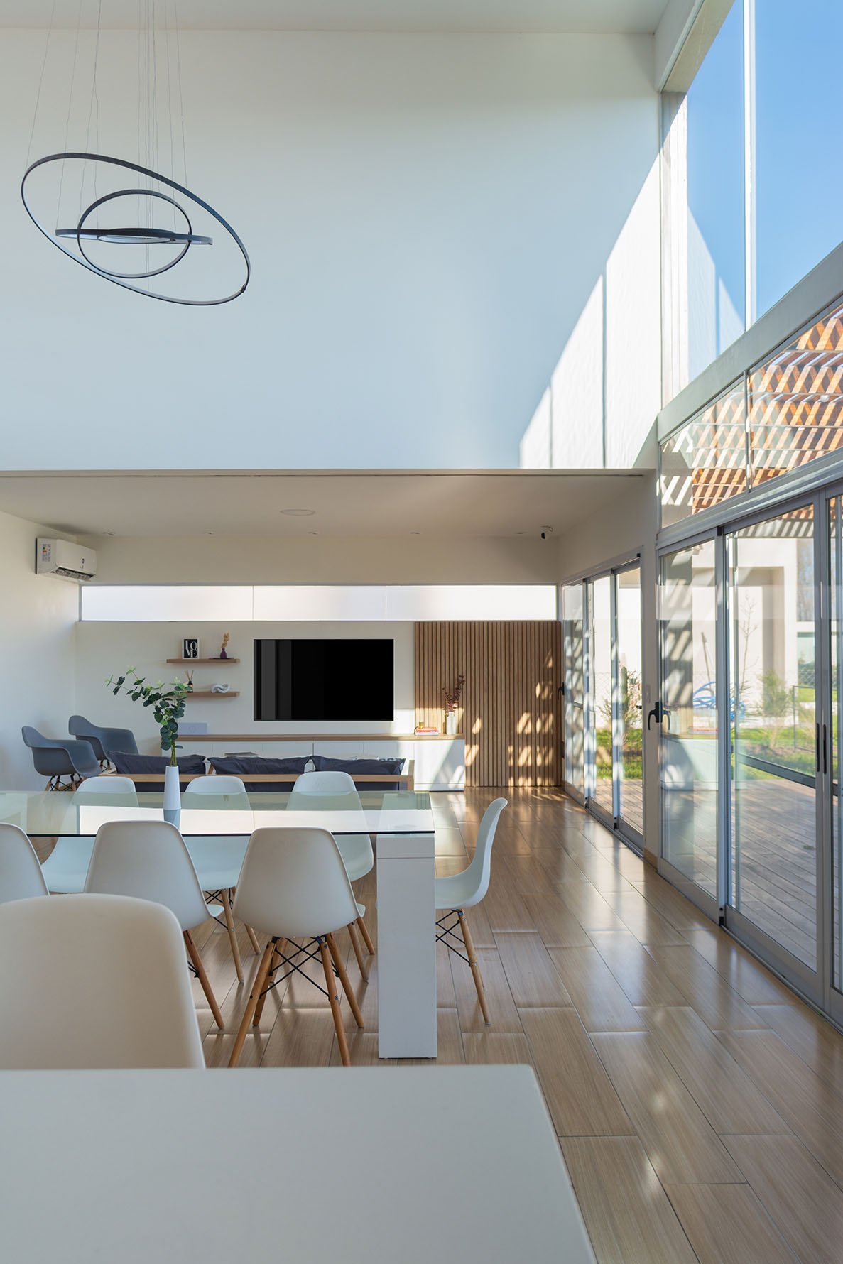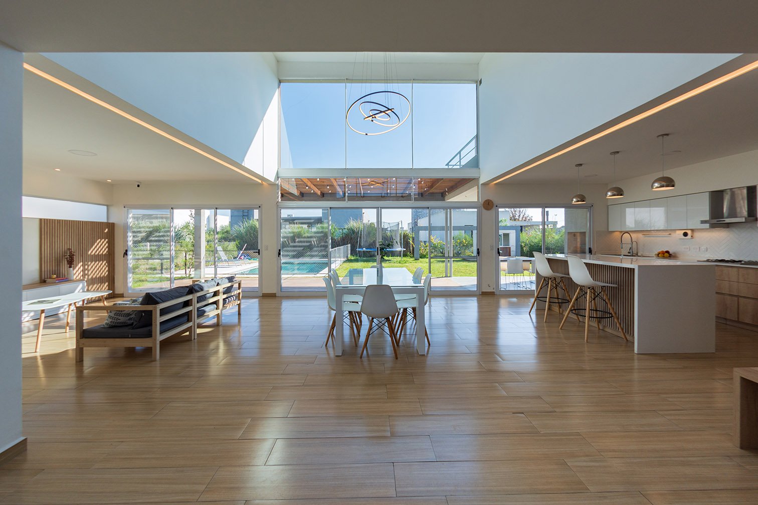 En planta baja se encuentra el área social: cocina, living y comedor. También tiene una habitación que puede utilizarse para recibir huéspedes o como escritorio. El eje del diseño interior se basa en una doble altura sobre el living comedor, genera un amplio espacio, con mucha iluminación. Por otra parte este puente que balconea sobre planta baja permite generar dos espacios bien delimitados en planta alta: un sector para el matrimonio y otro para los hijos. Es así que en planta alta sobre el lado derecho se encuentra una amplia suite con terraza propia y sobre la izquierda dos dormitorios con baño privado.