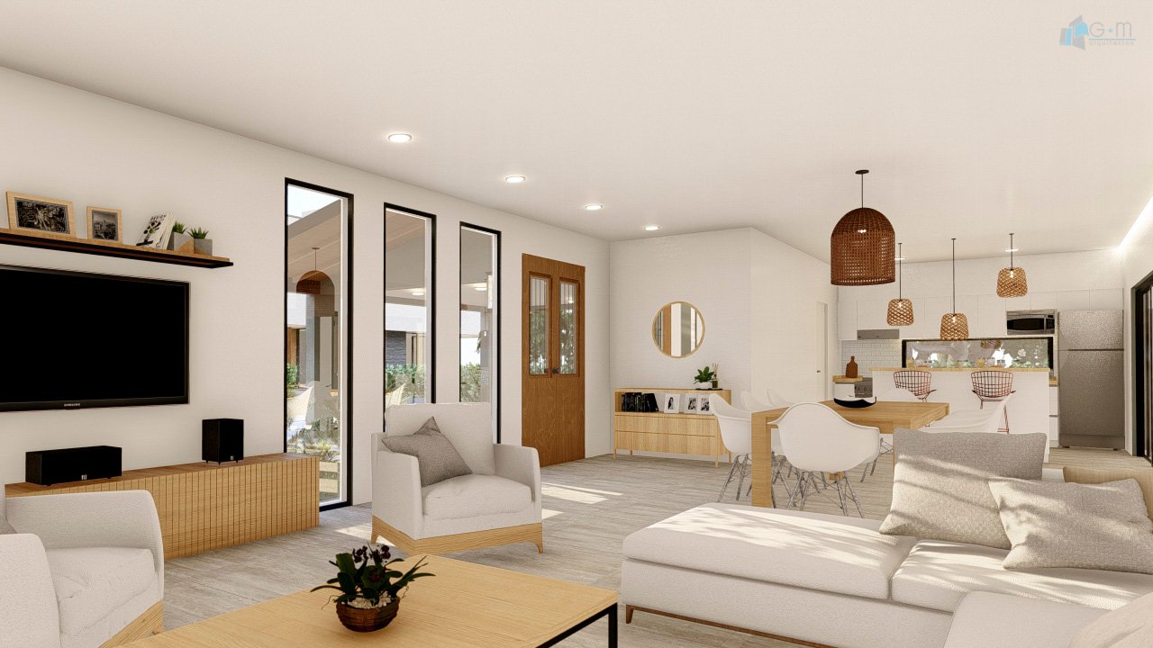 La escalera se ubicó en un espacio de doble altura en el que se realizó una pared de ladrillos de vidrio, lo que posibilita una gran entrada de luz, consolidando el espacio de la escalera como corazón de la casa.