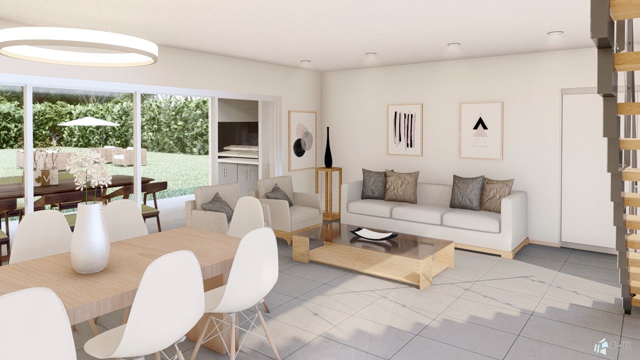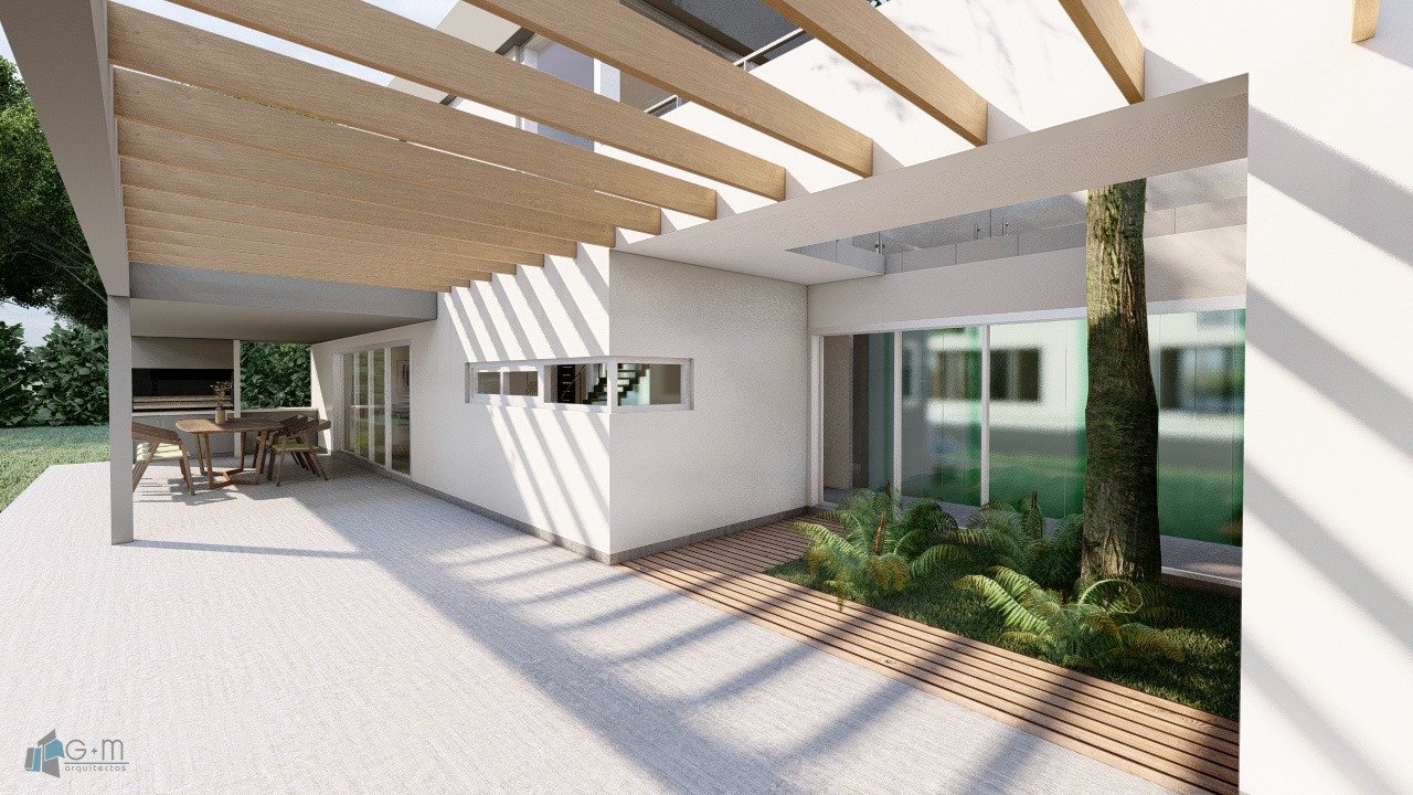 La casa se diseño para un matrimonio y el abuelo de uno de ellos. Por ese motivo, la planta baja se pensó en dos sectores: por un lado el área social que cuenta con living-comedor, cocina, lavadero y toilette y por otro la habitación para el abuelo. Quisimos lograr privacidad, es por ello que la habitación se separa de la casa, mediante un patio interno con galería vidriada. En la planta alta se encuentran las habitaciones para el matrimonio y sus hijos y un escritorio. La habitación matrimonial se diseño en suite con su baño y vestidor. Además, cuenta con una amplia terraza que permite lograr buena conexión con el exterior y aprovechar las visuales al campo.