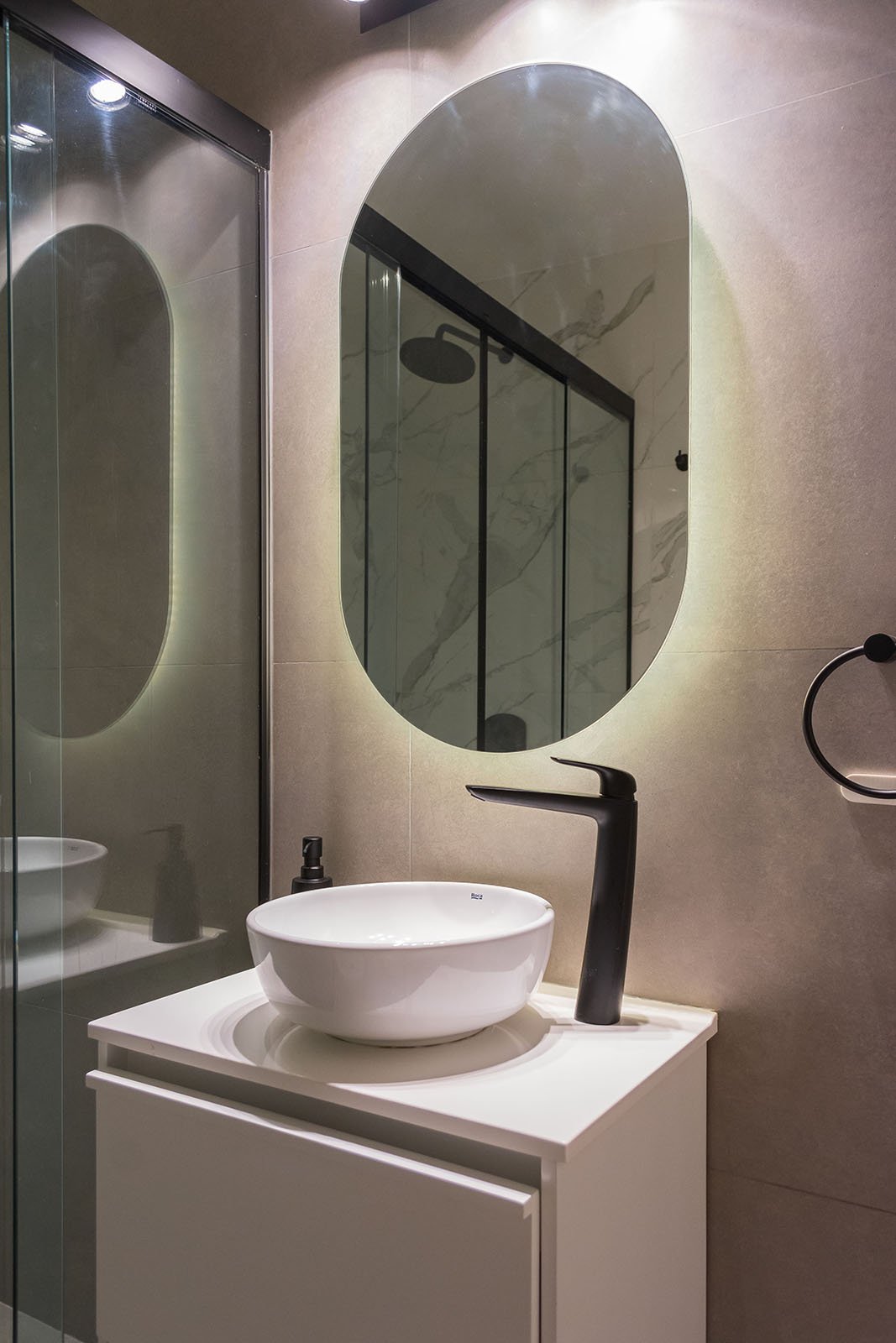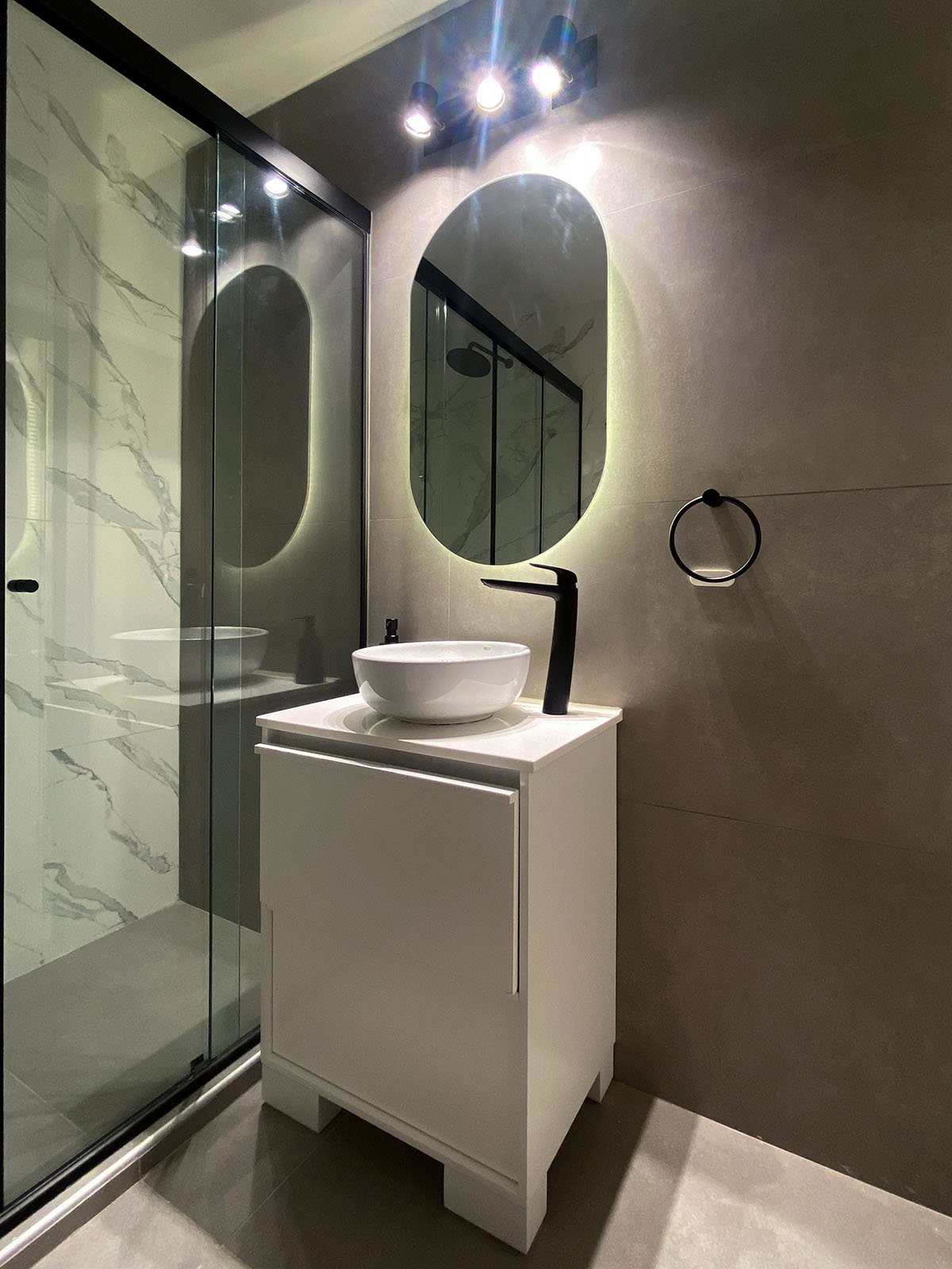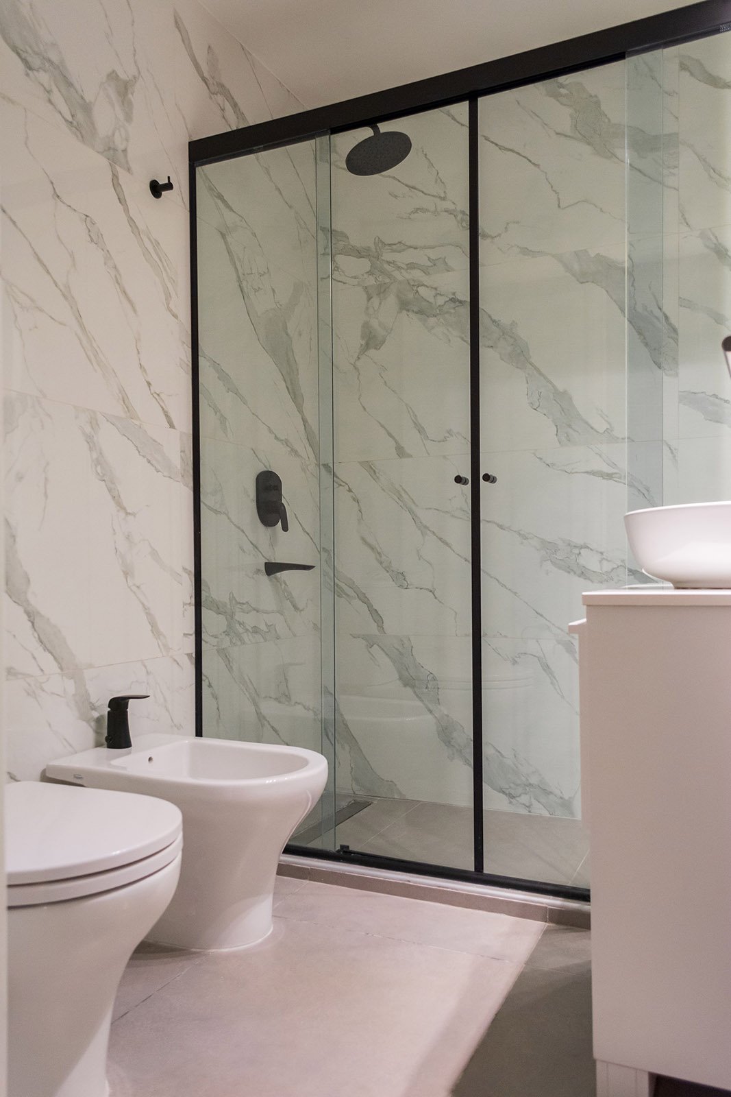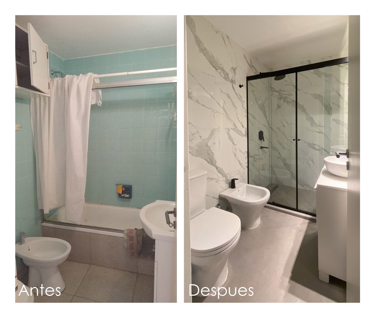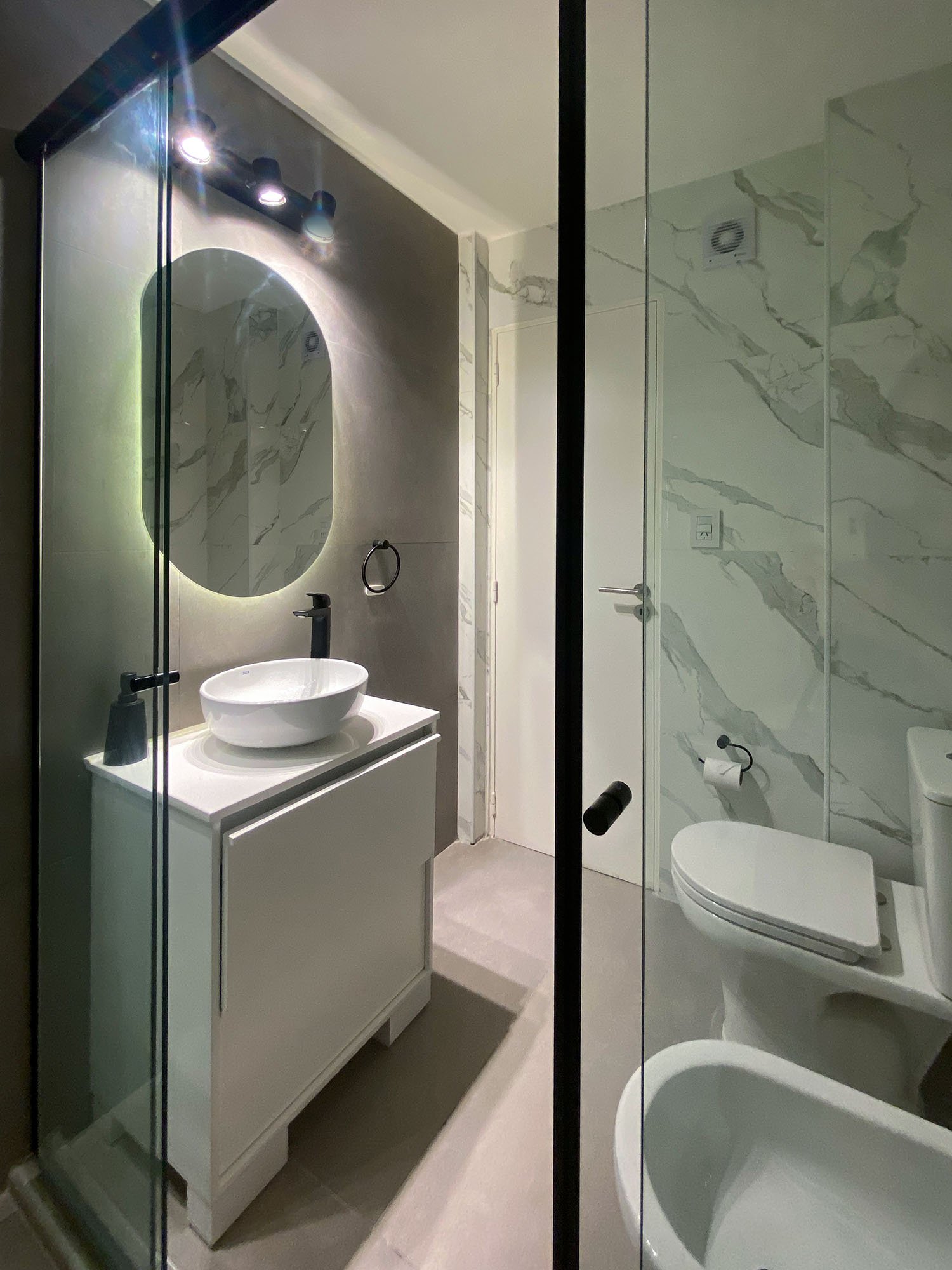 En el baño también se cambiaron la totalidad de las instalaciones y los revestimientos. Se colocaron revestimientos claros para lograr amplitud e iluminación. Se opto por un diseño moderno y minimalista.