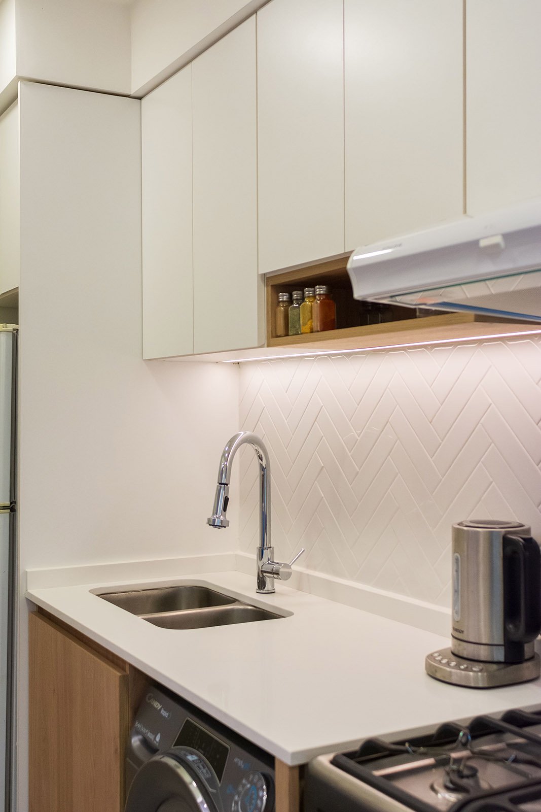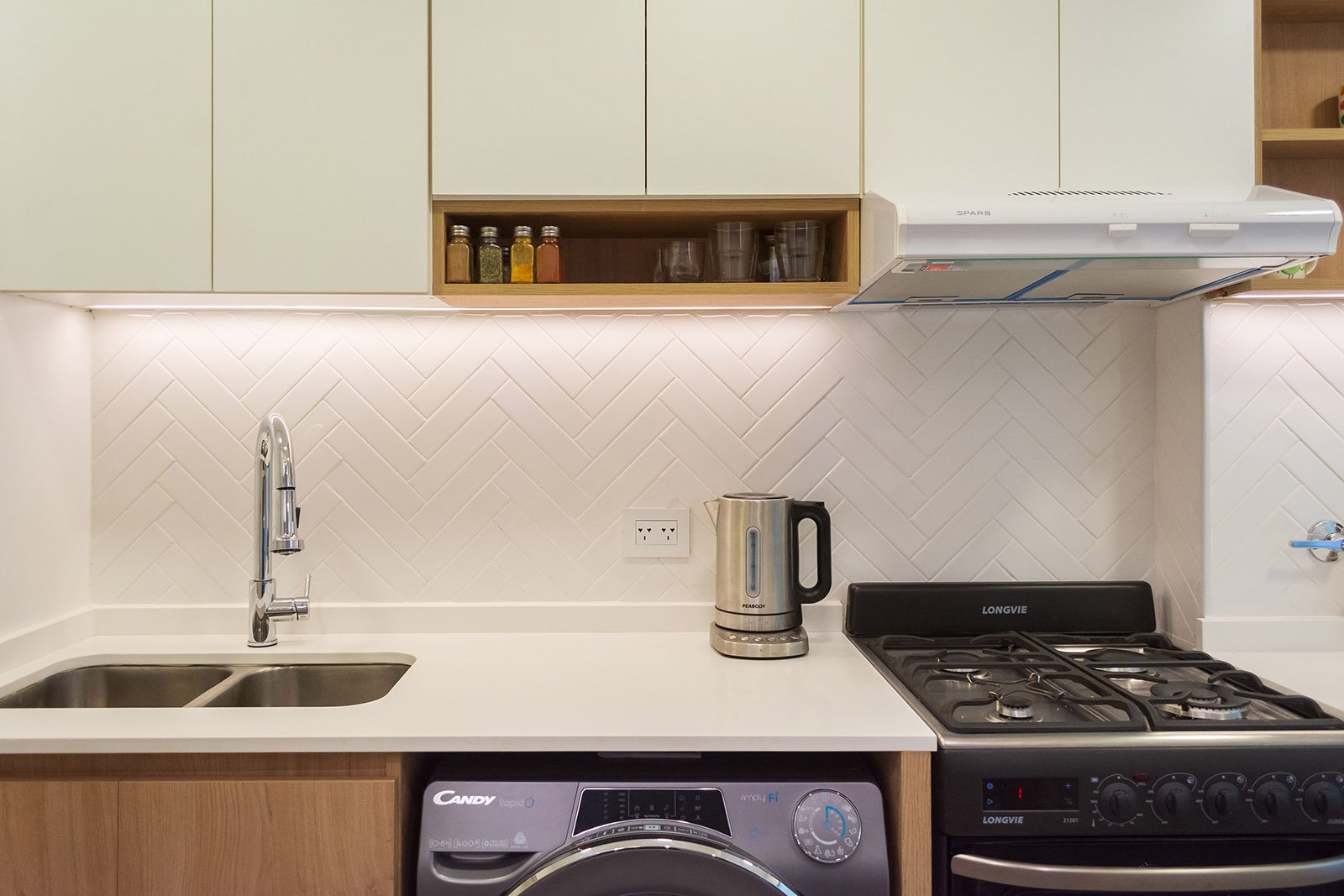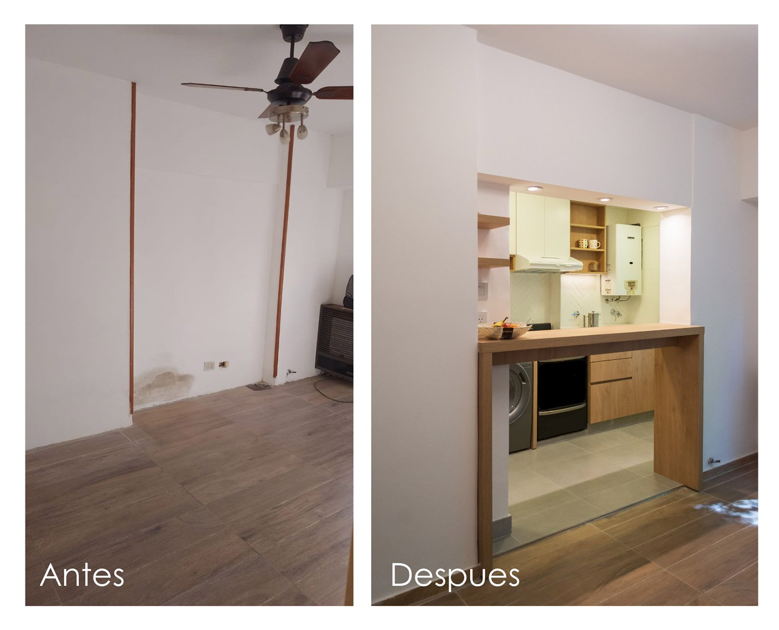 La cocina era pequeña, por tal motivo se decidió ampliarla tomando el espacio del lavadero y abrir un desayunador hacia el living para generar vinculación y amplitud.