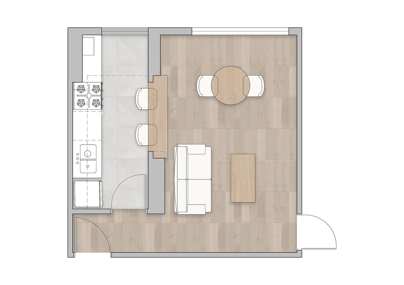Se eligieron colores claros tanto para mobiliario como para revestimientos para lograr calidez, amplitud y armonía. Se priorizó mejorar la iluminación tanto natural como artificial. Para ello se colocó un ventanal y se instalaron luces embutidas en cielorraso.