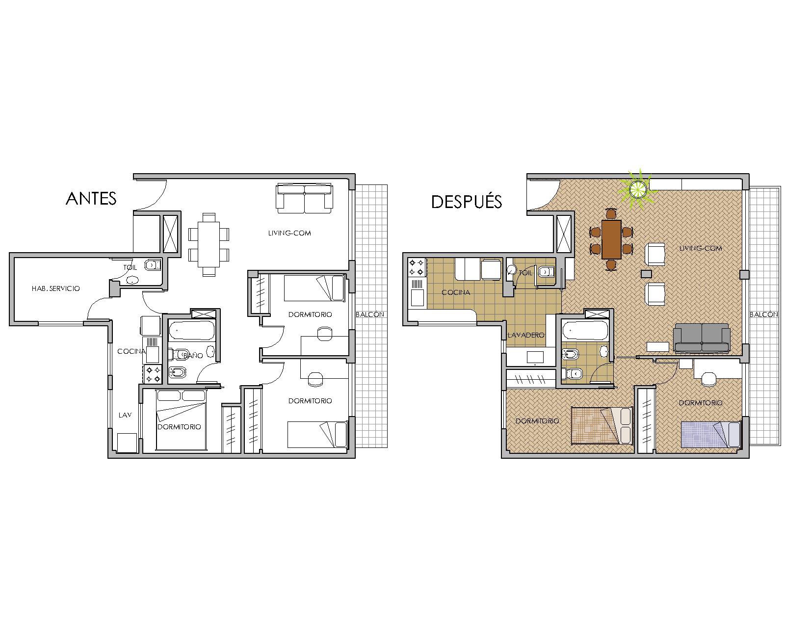 La intención del cliente fue mejorar la funcionalidad y comodidad del departamento, ya que era un 4 ambientes pero con un living muy pequeño y cocina y lavadero incomodo.