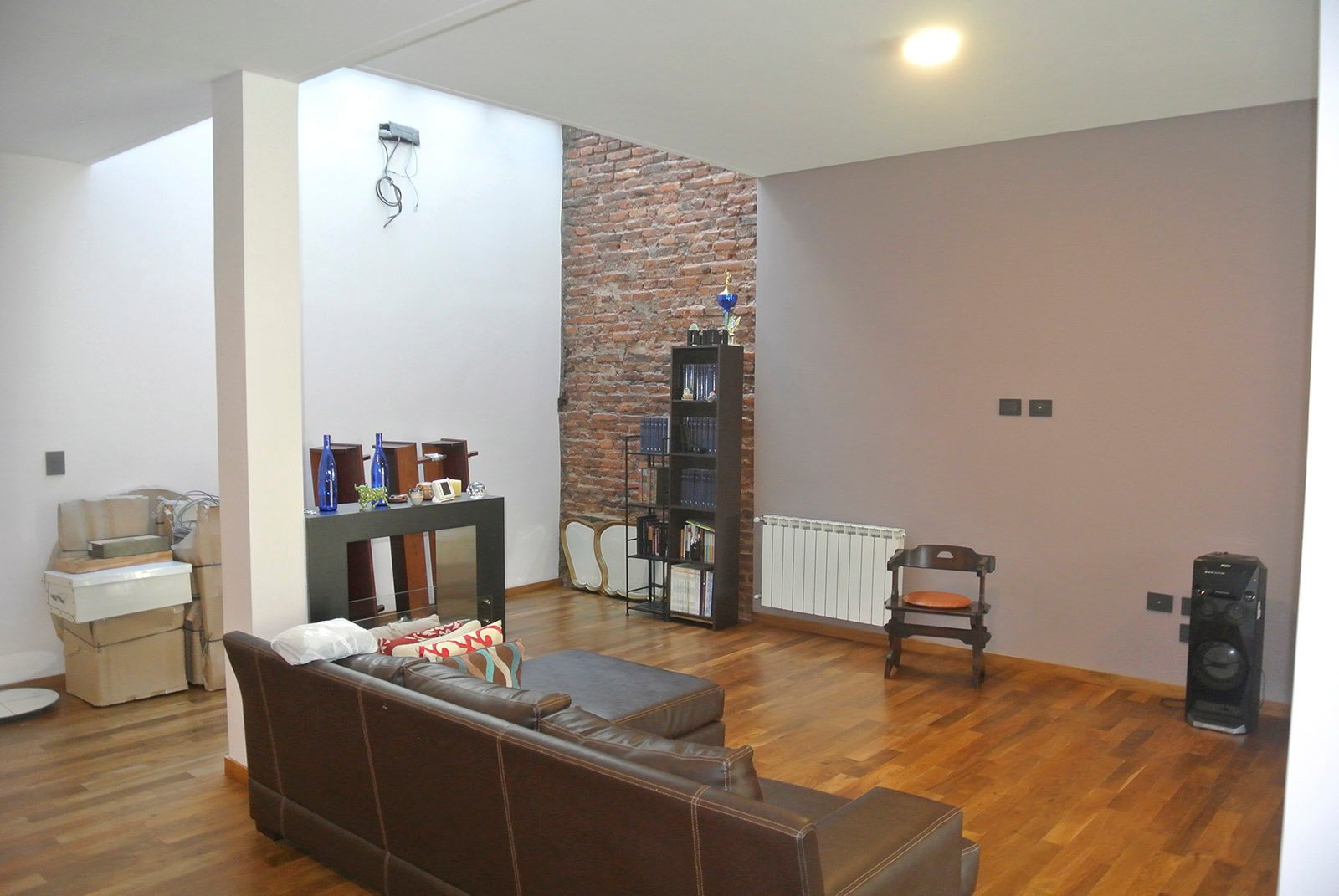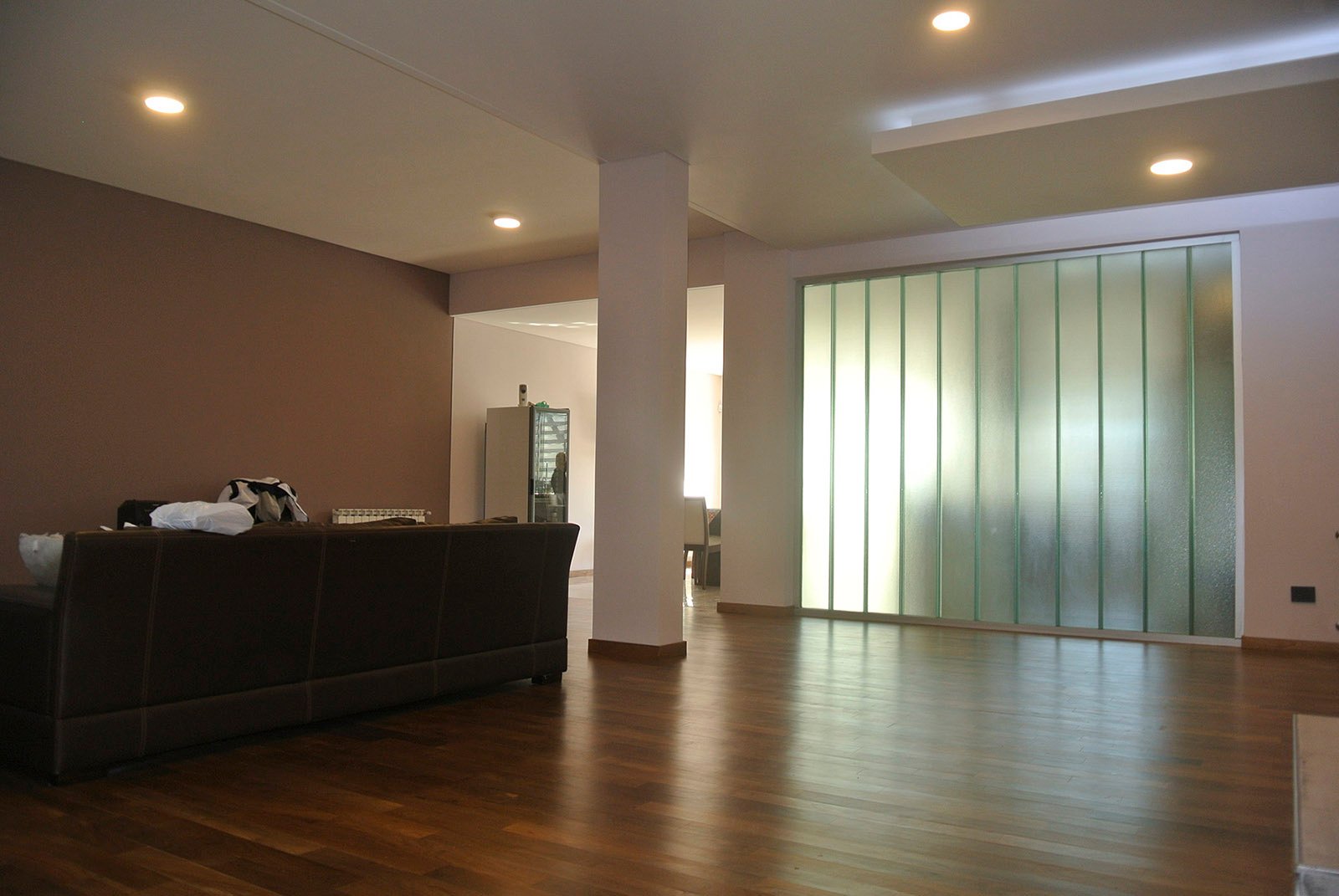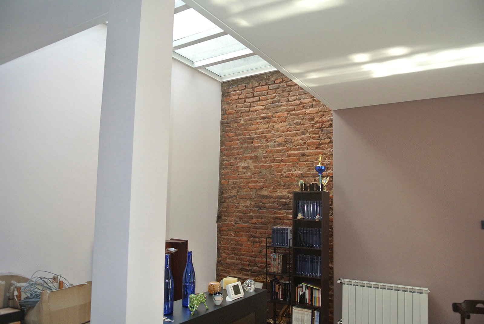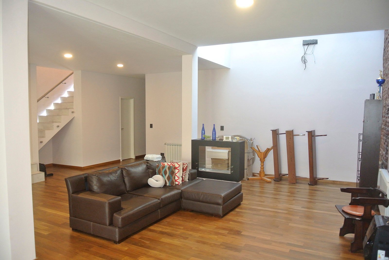 En planta baja se ubican el living, cocina, lavadero, comedor y cochera. Se amplió y se demolieron paredes para lograr espacios amplios. Se colocó un techo vidriado en el living para lograr buena iluminación, a su vez se restauró la pared de ladrillos. En planta alta se ubica el playroom, a pedido del cliente debería tener buenas dimensiones, y también los dormitorios. El matrimonial tiene su baño en suite, un amplio vestidor y terraza.
