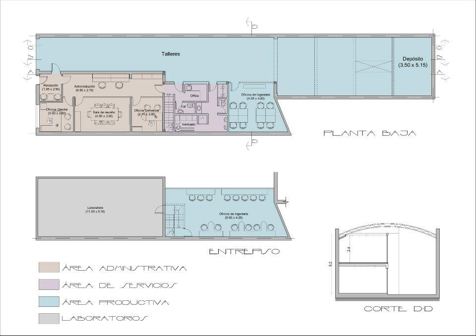 Se realizó una ampliación en planta baja, donde se ubicó el área de servicios (vestuarios, sanitarios, office), y la parte administrativa en el frente (oficina director, oficina comercial, sala de reuniones y administración).