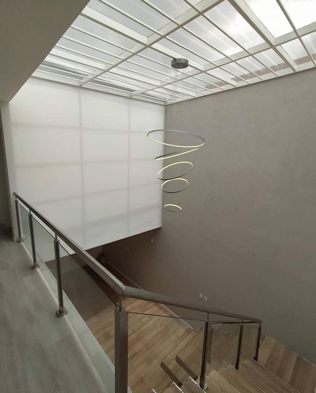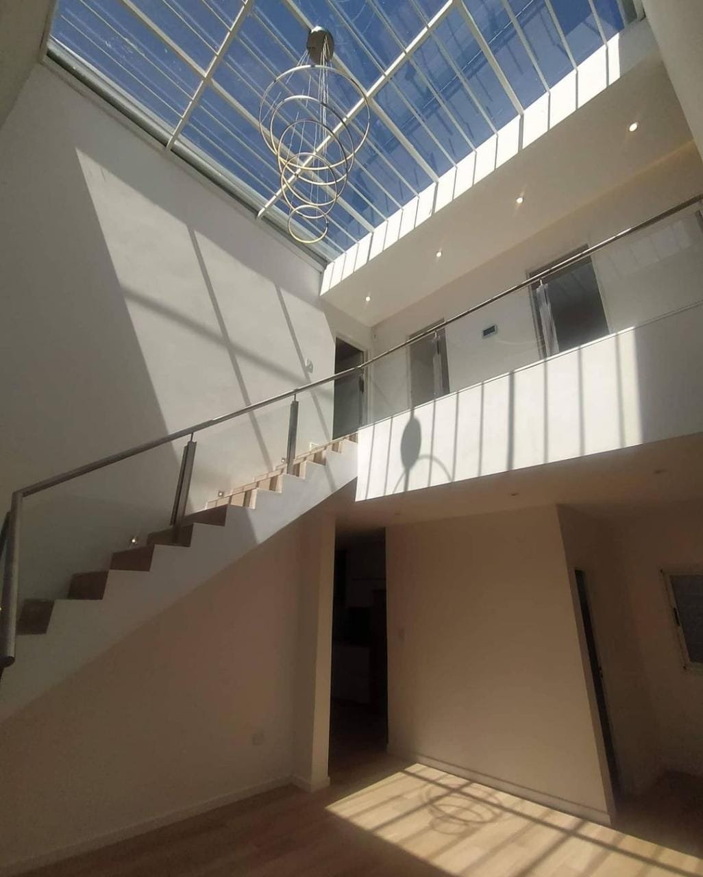 crear espacios amplios, con mucha iluminación. Se diseñó un espacio en doble altura en el living, con una cubierta vidriada, que logra generar un espacio moderno. En la planta alta se ubican los dormitorios, separando dos áreas: una para el matrimonio y otra para los hijos. La primera tiene vestidor, gimnasio y baño en suite. Además posee una amplia terraza balconeando hacia el gran parque del contrafrente.