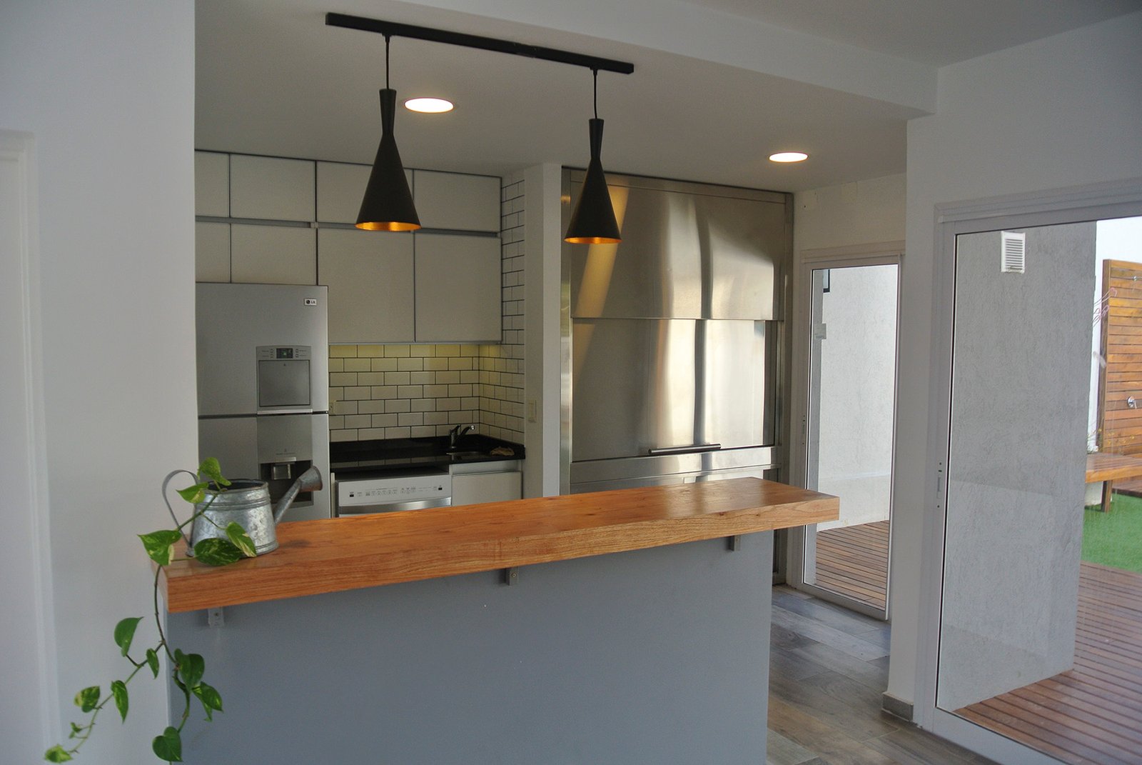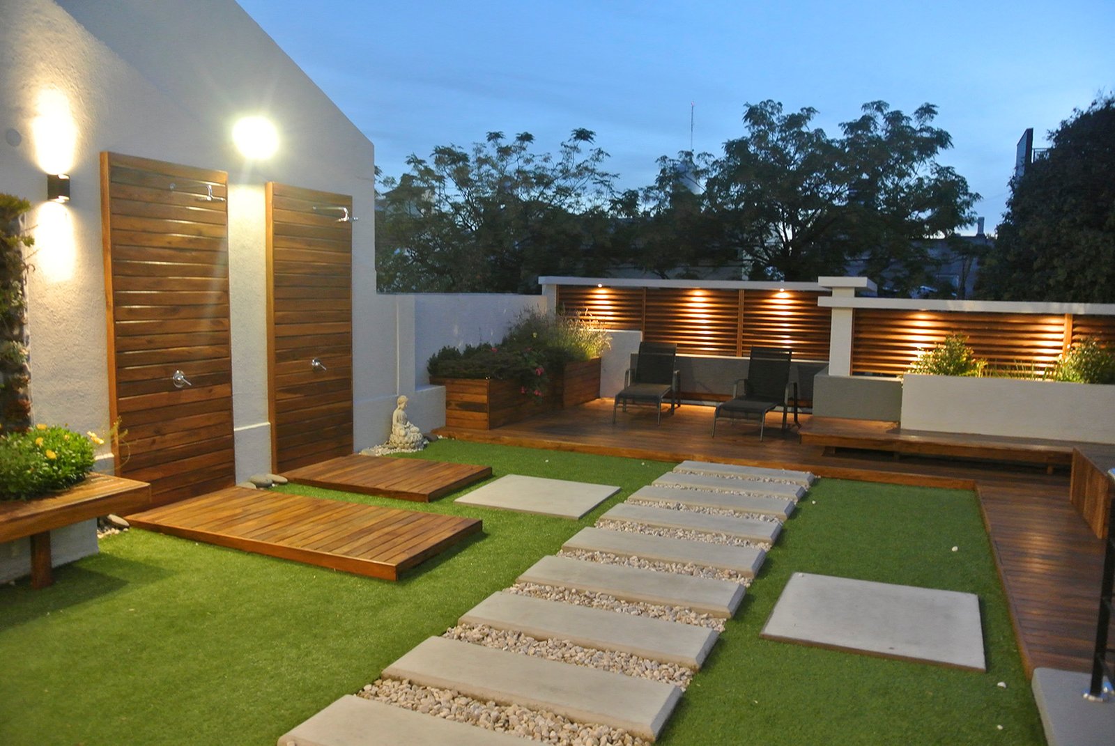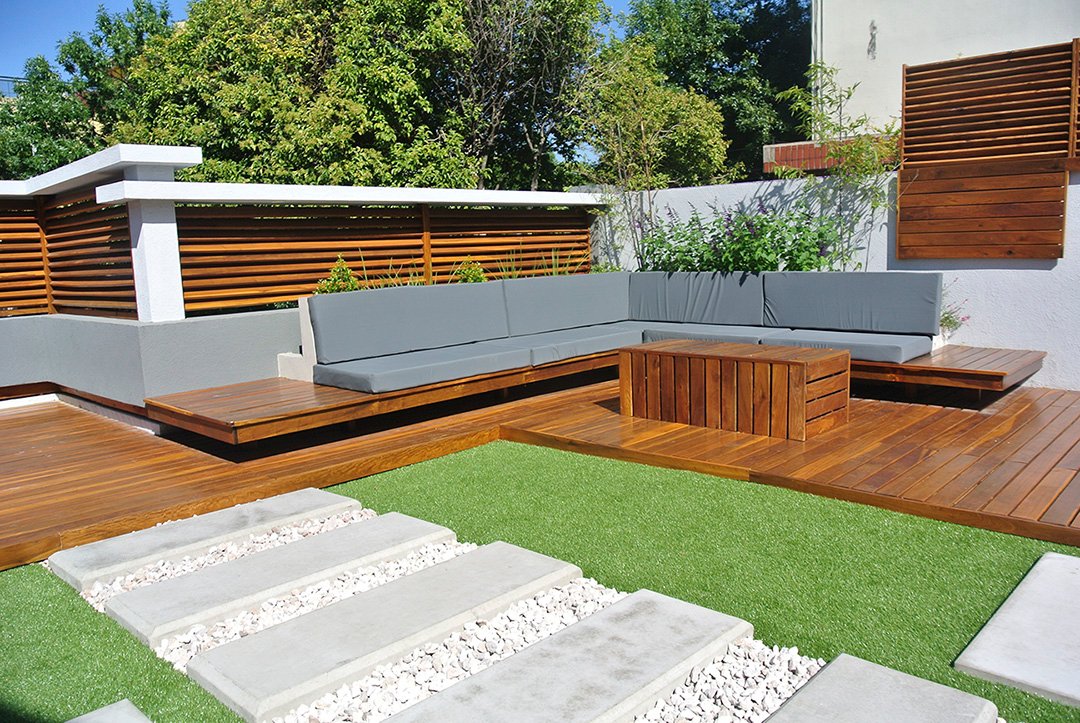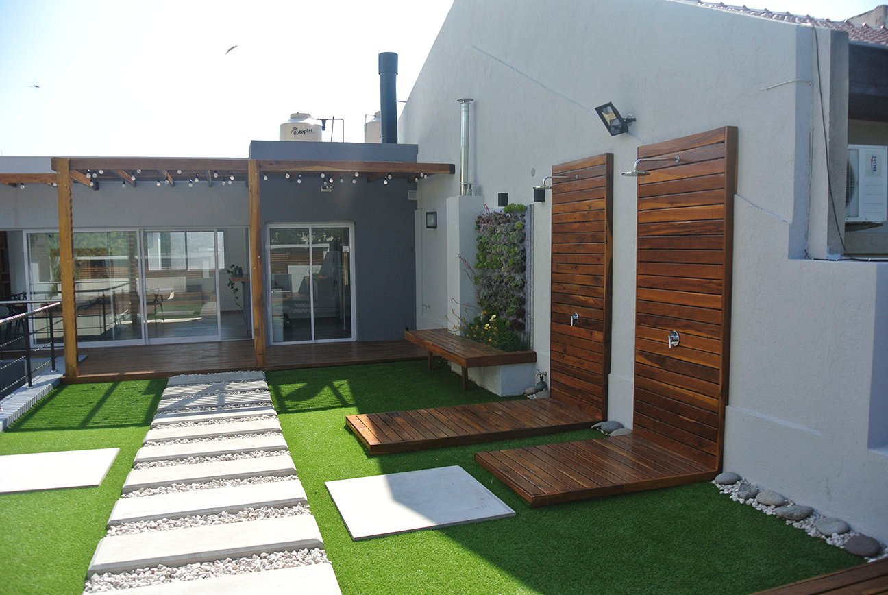 En la zona exterior se utilizó el lapacho tanto en decks como en bancos y canteros, se buscó generar un clima cálido con abundante vegetación. Se priorizó el aprovechamiento de los espacios al aire libre.