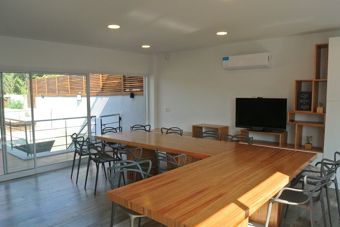 Se construyeron un quincho con parrilla y gimnasio y en la zona exterior un espacio de duchas y solárium con áreas de descanso. Para el interior se optó por un diseño moderno y minimalista con algunos detalles rústicos. Se priorizó la buena iluminación y ventilación con grandes ventanales que se vinculaban con el área exterior. Se utilizaron colores claros y madera para lograr un ambiente cálido y armónico.