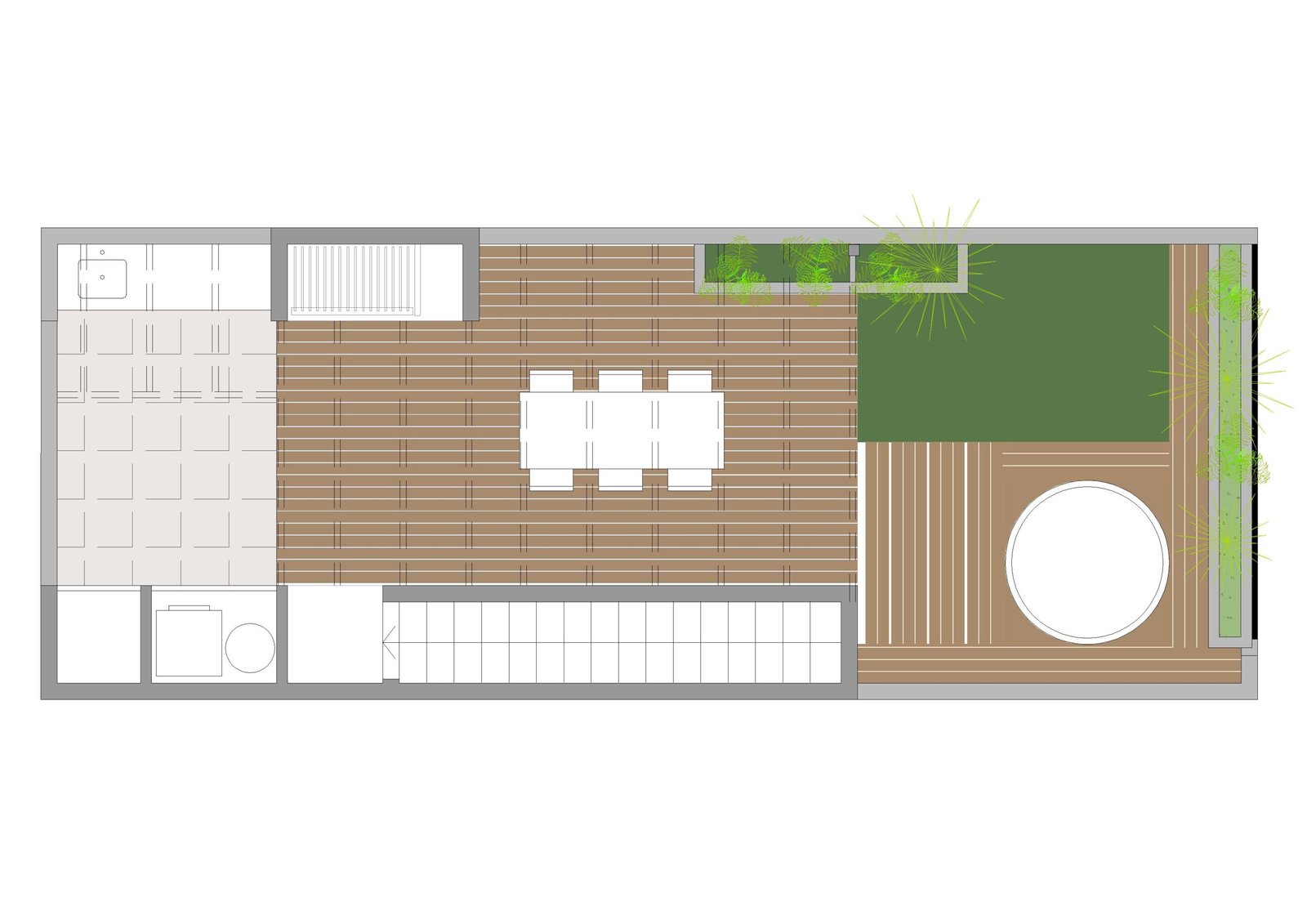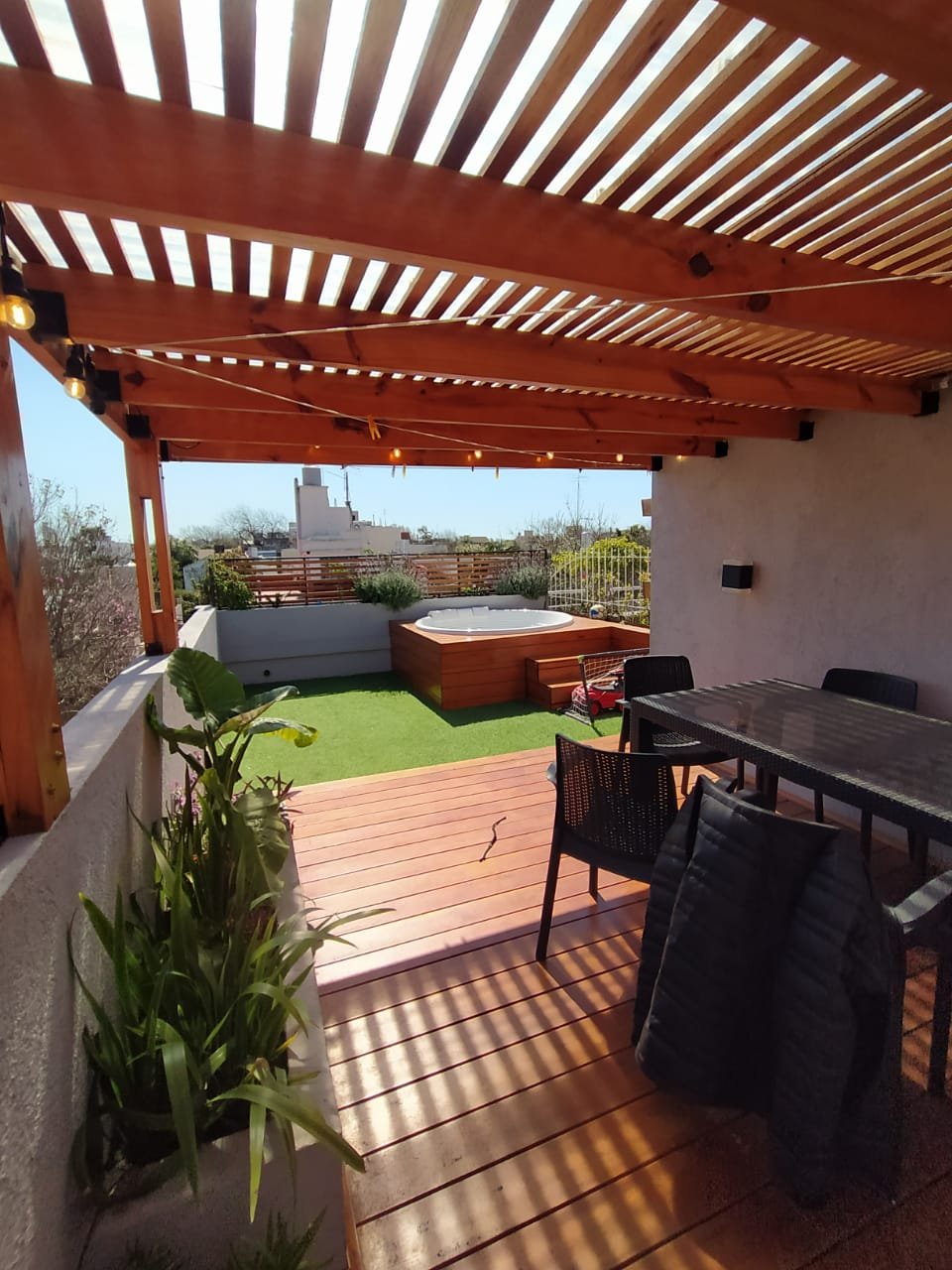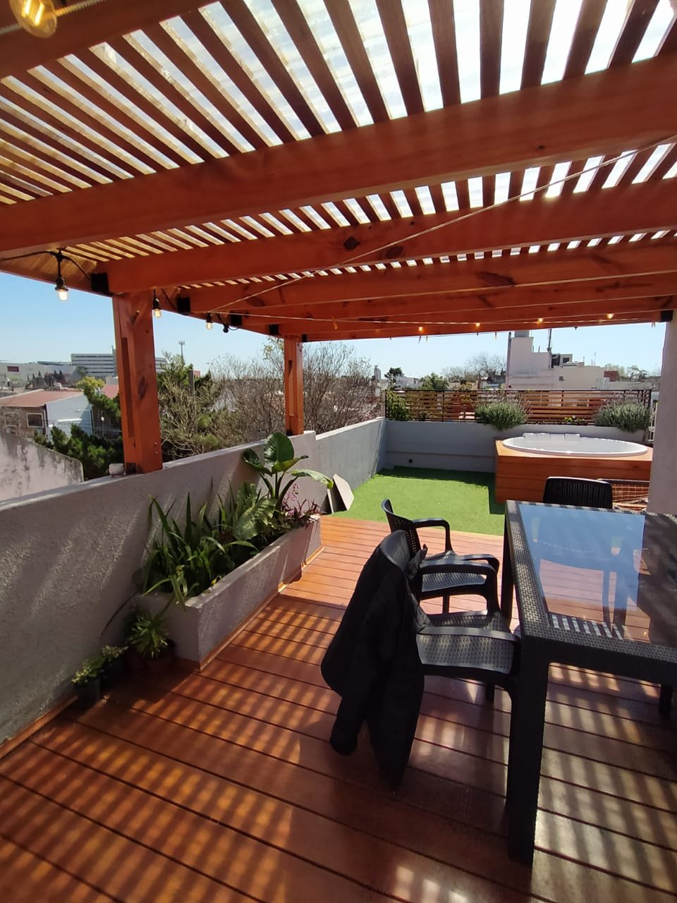 Se trató de optimizar al máximo el espacio. Se colocaron deck y pergola de madera, césped sintético y canteros con madera y revestimiento tipo tarquini.
